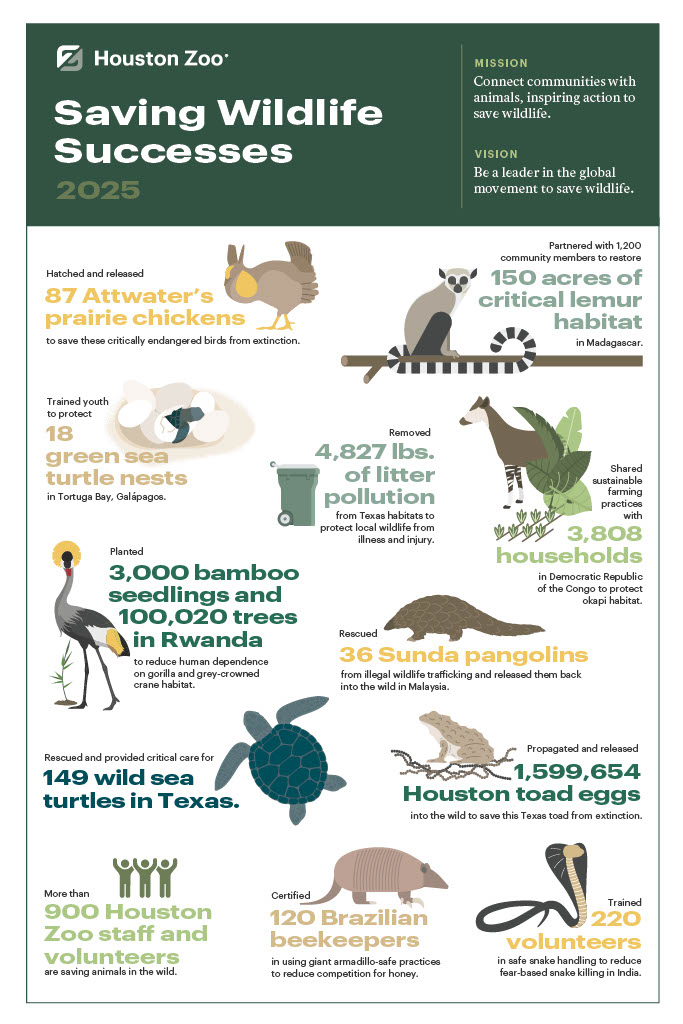 In 2025, the Houston Zoo and its global partners made powerful strides for wildlife. Together, we protected habitats, rescued imperiled species, and strengthened communities working on the front lines of conservation.