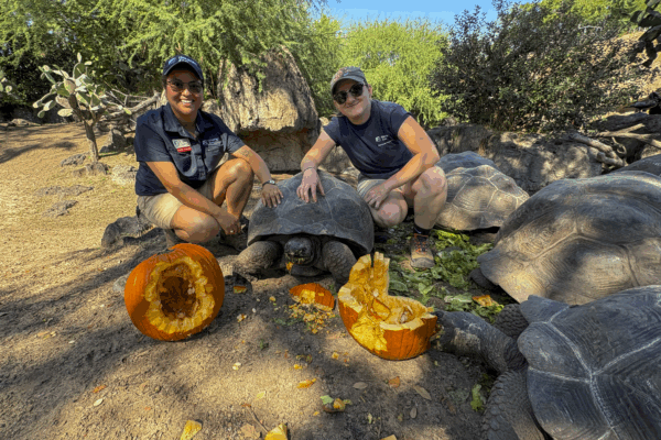 Pumpkin party with a purpose! Our Galápagos tortoises got into the Zoo Boo spirit with pumpkin enrichment, which is not only tasty but is also a great for their jaw and curiosity.
